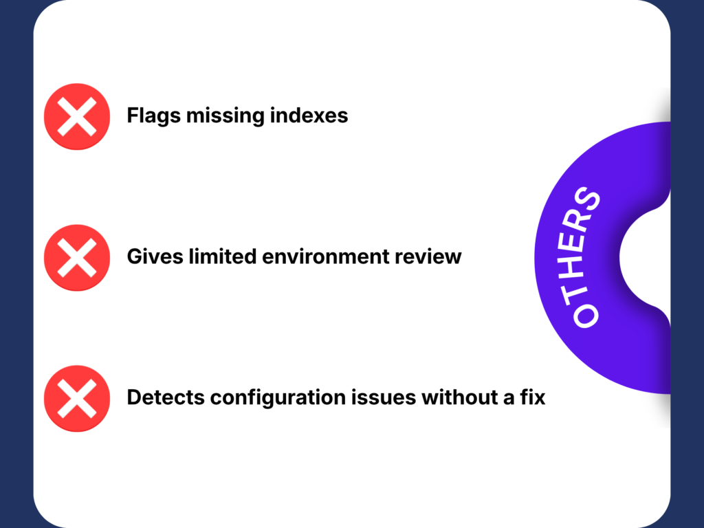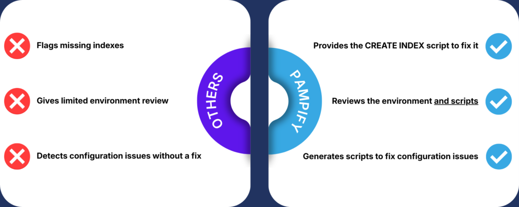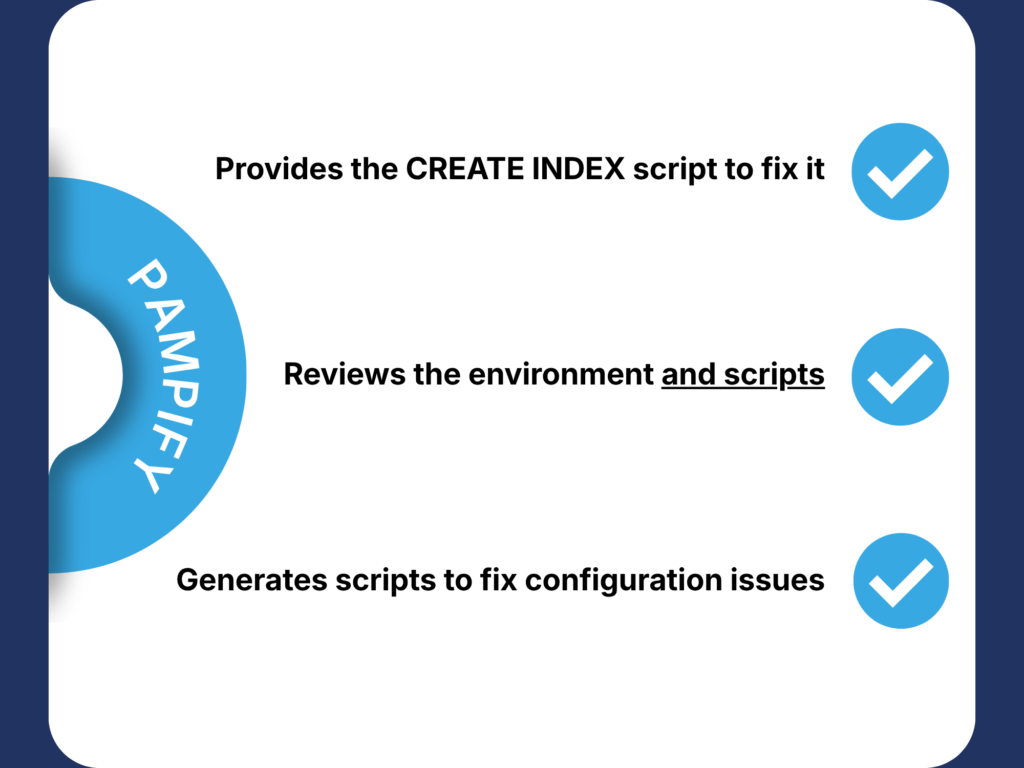 Queries that used to take minutes can be reduced to seconds. Pampify analyzes indexes, including missing, unused, and hypothetical ones, and provides the scripts needed to improve performance.